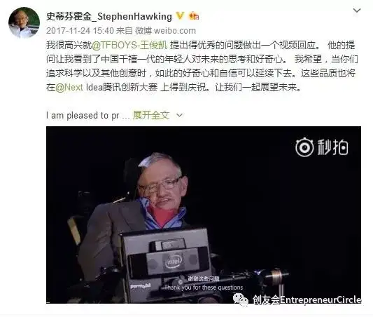 现在,霍金的微博最后一条定格在了2017年11月24日。他在这条微博上说,“我很高兴就@TFBOYS-王俊凯 提出的优秀的问题做出一个视频回应。他的提问让我看到了中国千禧一代的年轻人对未来的思考和好奇心。我希望,当你们追求科学以及其他创意时,如此的好奇心和自信可以延续下去。”