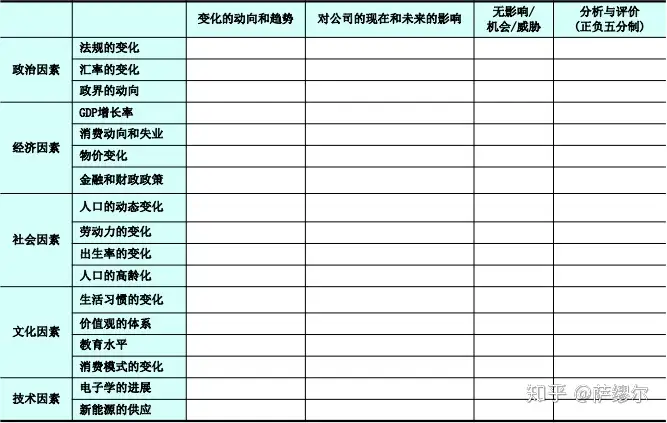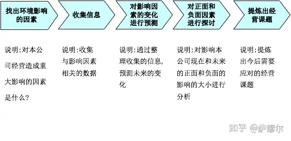 找出环境影响的因素:思考 对本公司经营造成重大影响的因素是什么?收集信息:收集与影响因素相关的数据对影响因素的变化进行预测:通过整理收集的信息,预测这些因素未来的变化及趋势对正面和负面因素进行探讨:对影响公司现在和未来的正面和负面的影响大小进行分析提炼出经营课题:提炼出今后需要应对的经营课题