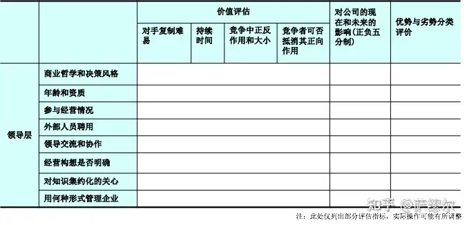 在分析企业经营实力时,可以分为领导层、生产与技术实力、业务结构、人力资源、财务和资源组织、组织实力和经营管理、市场营销实力、商誉等无形资产等对每一部分我们都要进行类似以下的分析(见示例如下)