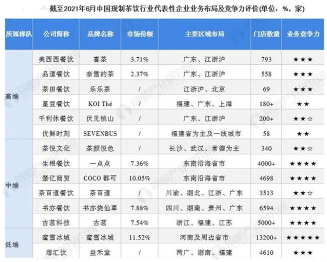 目前中国现制茶饮行业没有垄断性行业龙头出现,市场竞争主要以区域性市场竞争为主。其中,门店数量和市场份额最高的蜜雪冰城主要以河南及周边省市为中心布局到全国,一点点和COCO都可则是以东南沿海省市为主要布局区域,喜茶、奈雪的茶、伏见桃山是以广东、江浙沪为主布局门店。