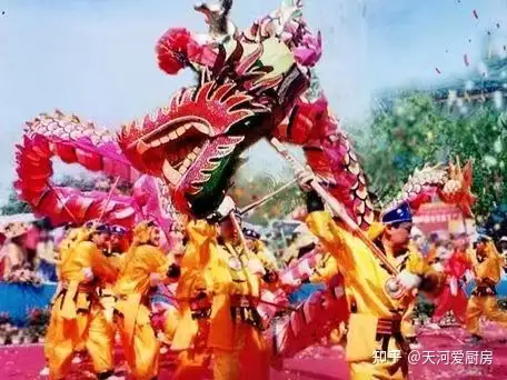 舞龙源自古人对龙的崇拜,每逢喜庆节日,人们都会舞龙,龙跟着绣球做各种动作,不断地展示扭、挥、仰、跪、跳、摇等多种姿势。