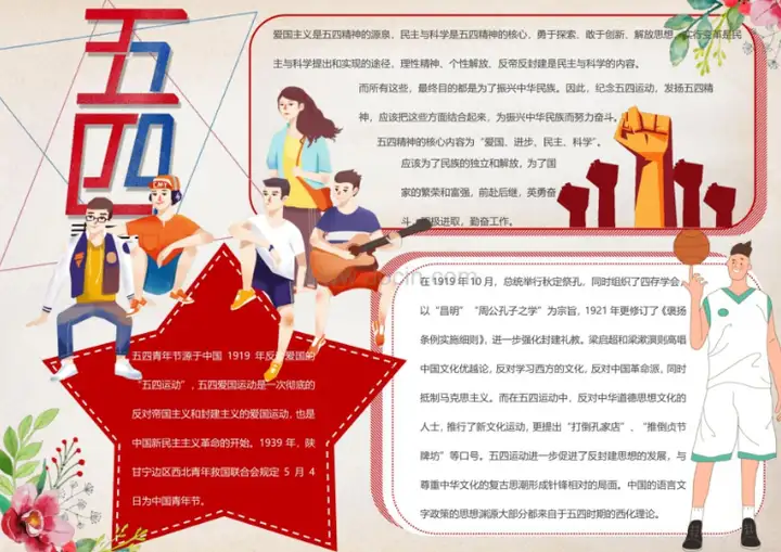 本次分享的五四青年节手抄报模板为卡通风格,包含爱国、五四核心等元素。