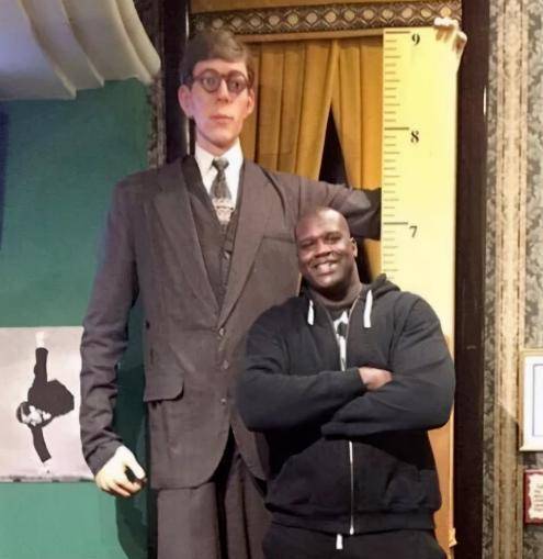 罗伯特·瓦德罗,人类有记载最高身高,达到了2米72。巨人症导致他22岁夭折,为了纪念他制作的1比1模型,让奥尼尔在合影时只够到对方胸口位置。
