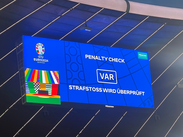 其中,海信是第三次亮相欧洲杯赛场,在官方赞助商身份之外,今年还作为2024欧洲杯VAR(视频助理裁判)提供显示技术支持,助力裁判做出更精准的判断。