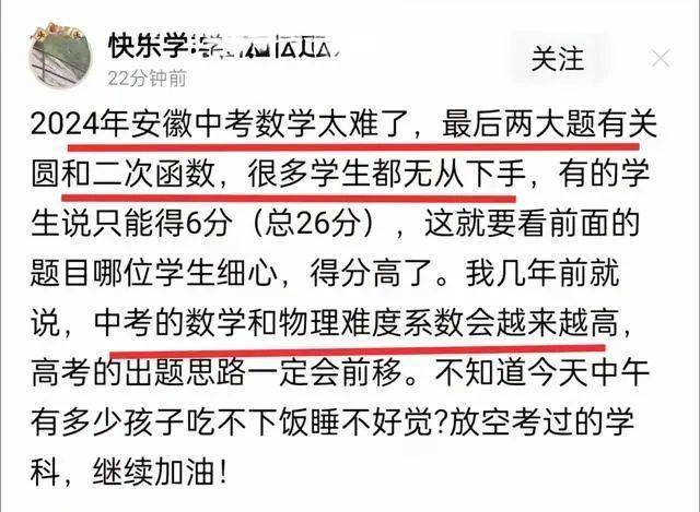 那对于2024年安徽中考数学卷,老师们又是怎么说的呢?有一位老师网络发文说,这次数学考试难度太大,尤其是:圆和二次函数:很多考生没有思路,不少学生觉得自己就只能得到6分,那一下子20多分没有了,这是非常严重的。