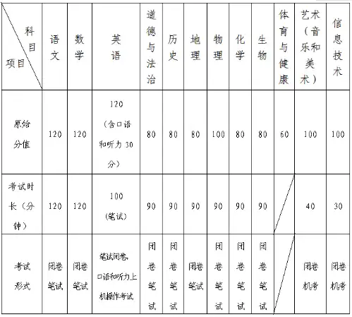 2022年初中学业水平考试科目原始分值及考试时长