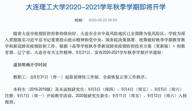 大连理工大学秋季开学时间已经确定,2020级本科生新生于9月20日-21日入校报到,各位新生签收录取通知书后一定要及时做好开学准备,按时报到注册入学。