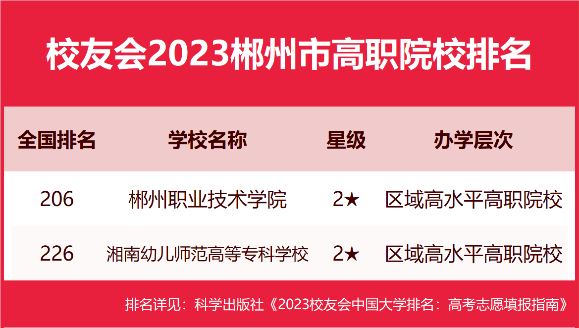 在最新校友会2023中国高职院校排名中,郴州职业技术学院综合排名最高、办学水平最高,全国排名第206名,名列校友会2023郴州市高职院校排名冠军。湘南幼儿师范高等专科学校位居全国第226名,名列第2名。