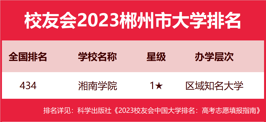 在最新校友会2023中国大学排名中,湘南学院综合实力排名最高、办学水平最高,全国排名第434名,荣登校友会2023郴州市大学排名第一。