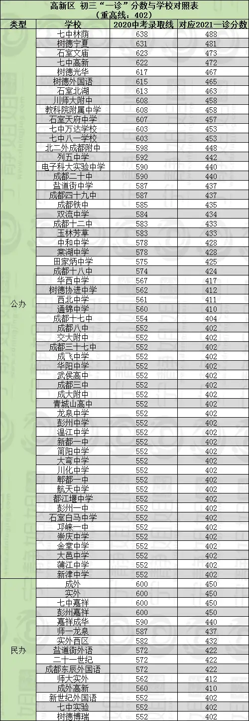 按照往年惯例,各区重高线的名称有些不同,高新区称为中线,武侯区称为B优线,其他区称为高线。从家长群分享的内容来看,目前各区的重高线信息有:高新区402分、金牛区414分、青羊区416分、锦江区418分(推测)、武侯区402分、高新区402分、天府新区441。