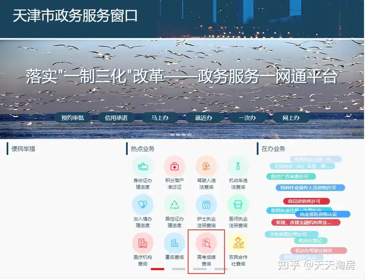 3.登录全国一体化在线服务平台(https://gjzwfw.www.gov.cn/),在天津政务窗口,点击“高考成绩查询”服务。