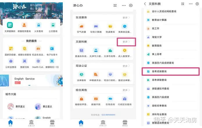 4.登录“津心办”APP、“津心办”支付宝小程序,在“文旅科教”服务中找到功能查询入口,点击“高考成绩查询”专区,进入查询页面。
