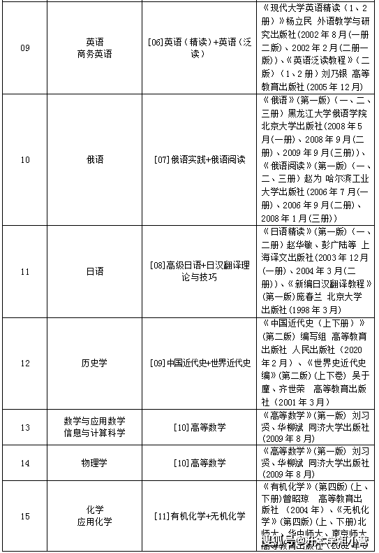 部分专业对应专业课考试科目: