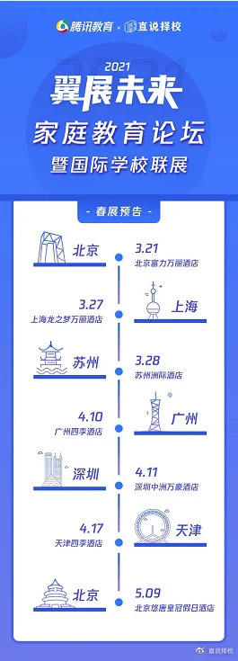 为了解决家长们的择校难题,帮助孩子们及时了解目前学习的状态和成绩水准适合选择什么样的学校来完成升学大计,2021年,“腾讯教育”携手“直说择校”将在全国各地举办新一届家庭教育论坛暨国际学校联展。届时将有来自全国各地多所国际学校,共同为大家带来一次“择校盛宴、选校大餐”。