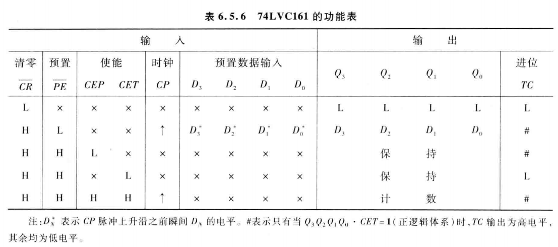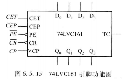 74LVC161 是一种典型的高性能、低功耗CMOS 4位 同步二进制递增计数器。芯片的逻辑功能和实现原理与图6.5.14所示逻辑图相同。它的时钟最高工作频率可达 200MHz