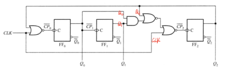 在例6.4.2中曾分析过一个具有000~100 五个连续二进制编码状态的异步计数器。