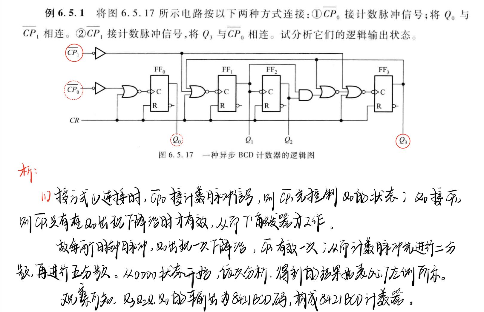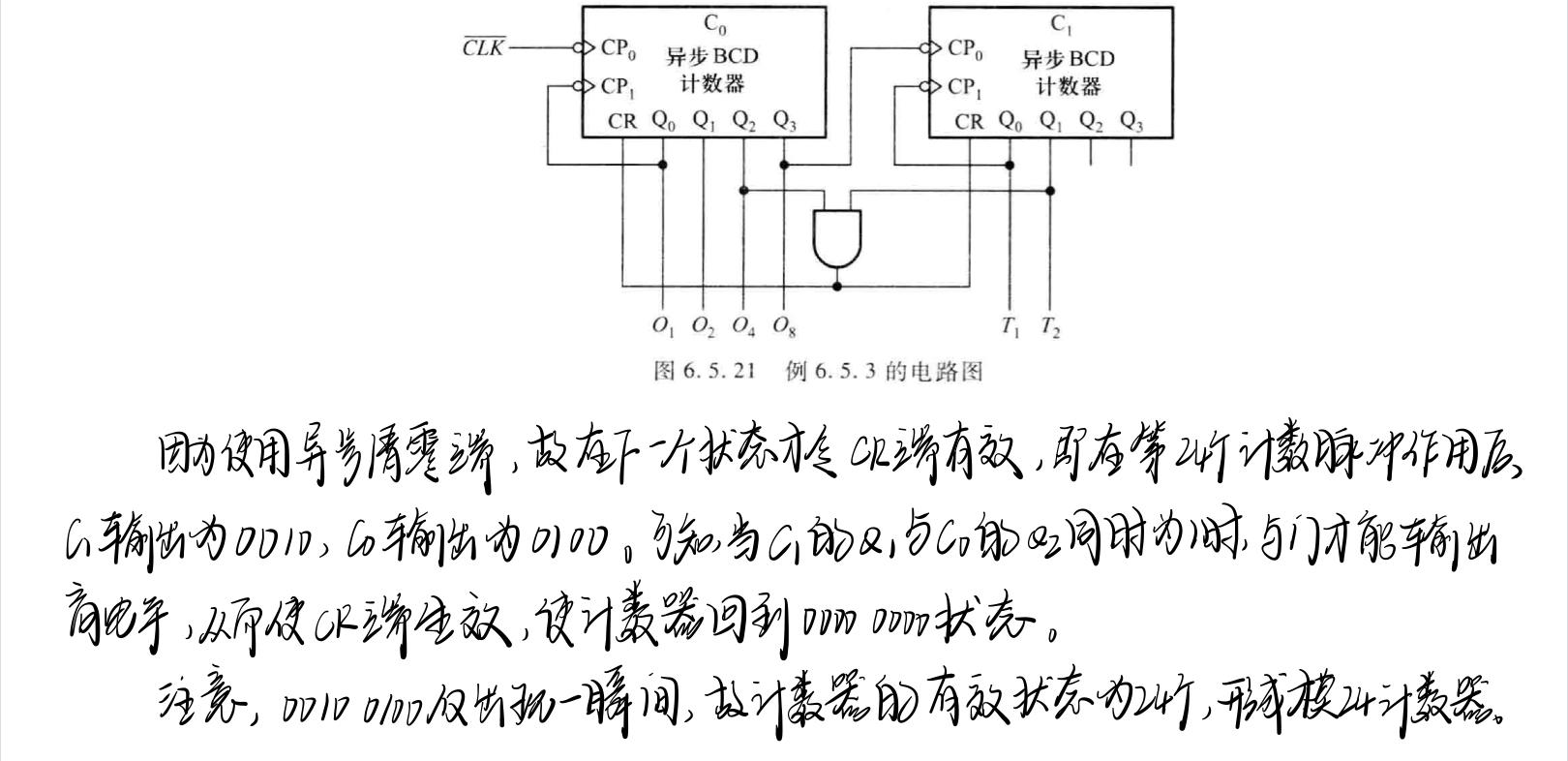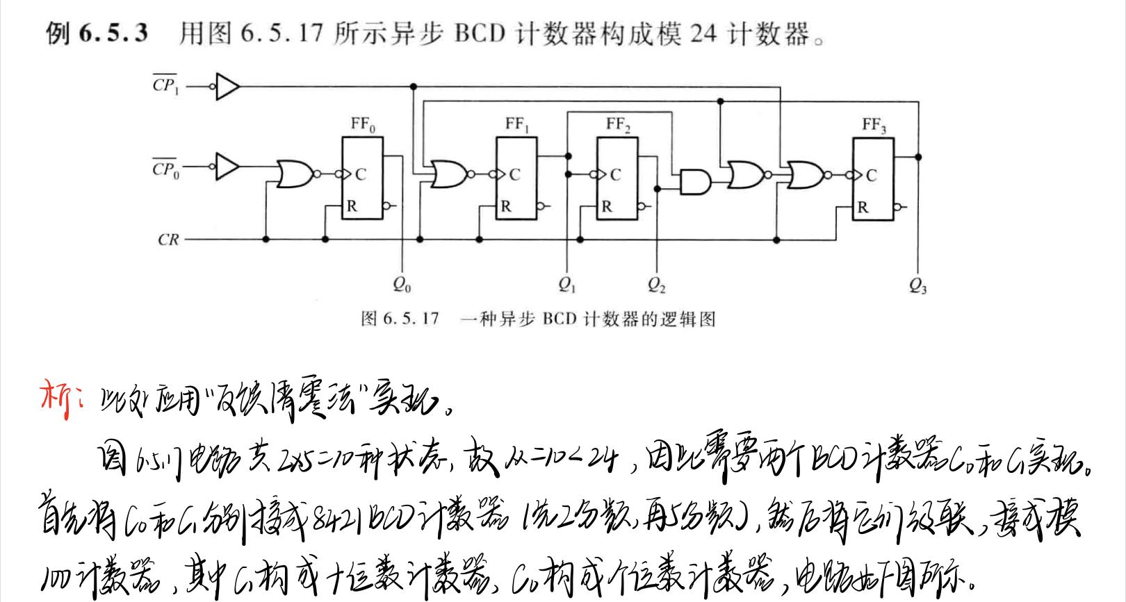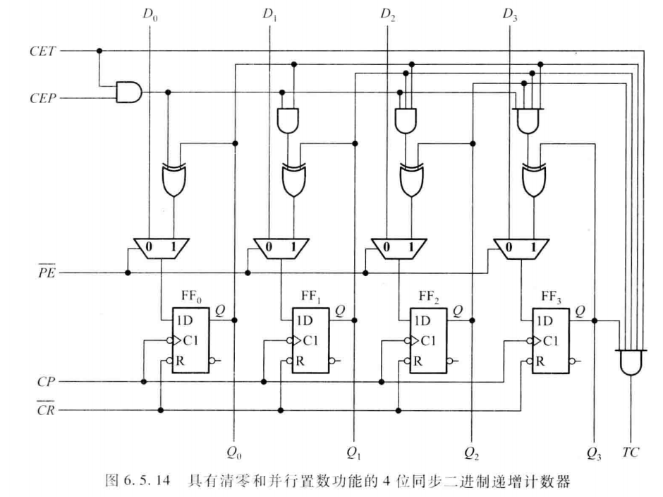 图6.5.11所示电路的进位信号是通过一系列串行的逻辑门逐位向高位传递的,这种计数器称为同步【串行】计数器。