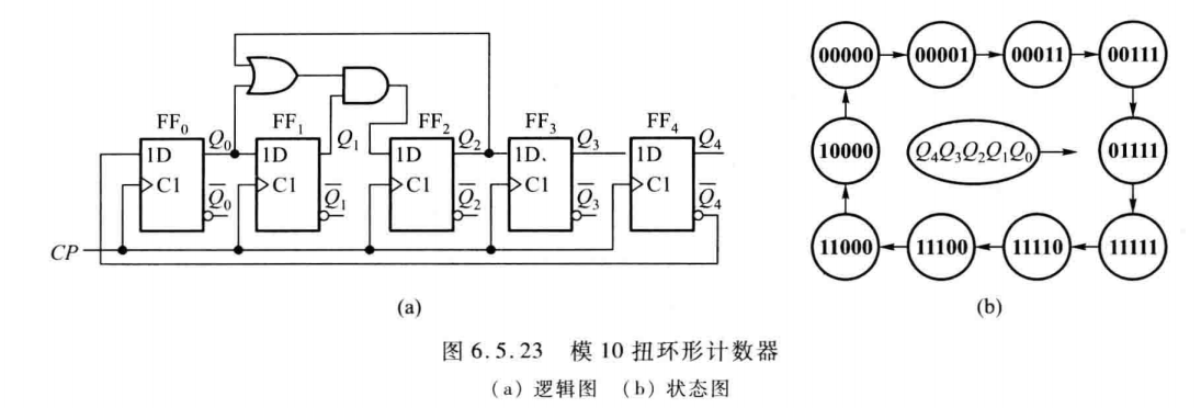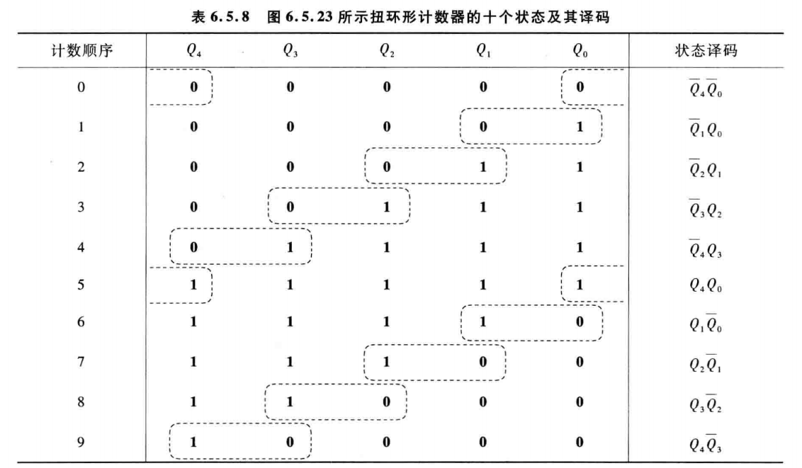 图6.5.23(a)所示是5个触发器构成的扭环形模10计数器,图6.5.23(b)所示是其状态图,表6.5.8列出了它的十个状态以及对各状态译码的逻辑表达式。