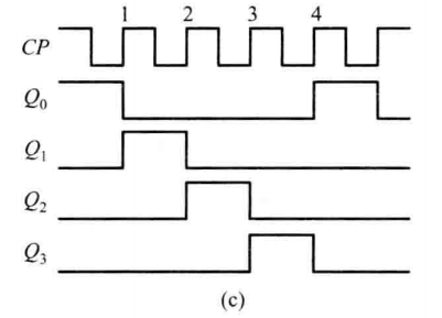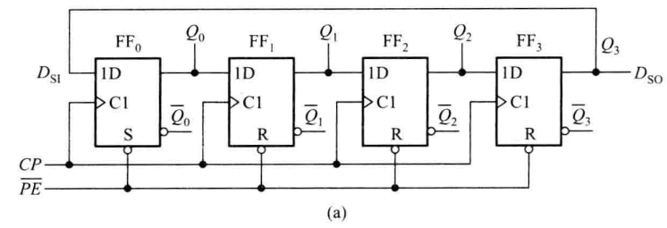 若事先通过 \bar{PE} 端施加低电平脉冲,在4个触发器内置入数据 Q_{3}Q_{2}Q_{1}Q_{0}=0001 ,那么环形计数器在 CP 脉冲用下,将会有如图6.5.22(b)所示的4个状态。