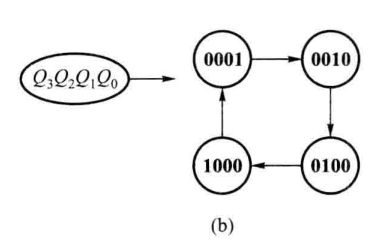 如果将图6.5.2中移位寄存器的 D_{SO}(Q_{3})D_{SI} 相连,则构成环形计数器,如图6.5.22(a)所示。
