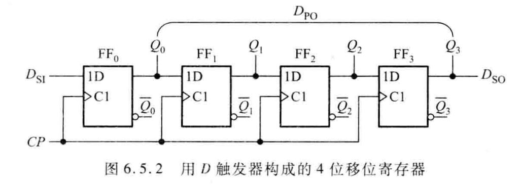 由图6.5.14 看出, D_{3}D_{2}D_{1}D_{0} 为4位并行数据输入端,当 \bar{PE}=0 时,数据选择器选择并行数据送至相应触发器的 D 输入端,这样,在下一个 CP 沿到来时,输入端D_{3}D_{2}D_{1}D_{0}的数据被并行置入各触发器。这种在时钟脉冲作用下的并行置数称为【同步】置数。