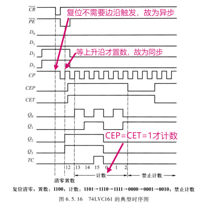 由图6.5.14看出,\bar{PE}=0具有次高优先级,仅低于\bar{CR}=0,计数和保持状态的操作都要求\bar{PE}=1
