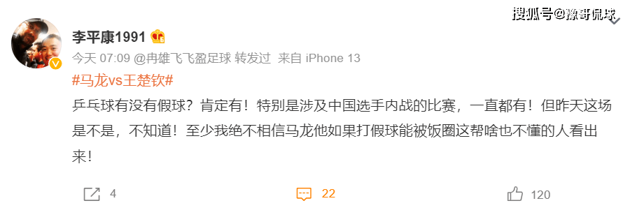 至于赛后有关假球的话题冲上了热搜,反观知名体育记者李平康在社交媒体发文表示:乒乓球有没有假球?肯定有!特别是涉及中国选手内战的比赛,一直都有!但昨天这场是不是,不知道!至少我绝不相信马龙他如果打假球能被饭圈这帮啥也不懂的人看出来!