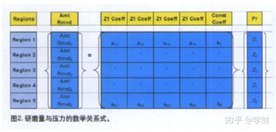 为了建立一个对晶片内均匀性控制的模型,首先需要把晶片分成 5 个区域,对于任何一个区域,都可以用一个线性的方程式来表达在一个区域内的研磨量与压力的关系。