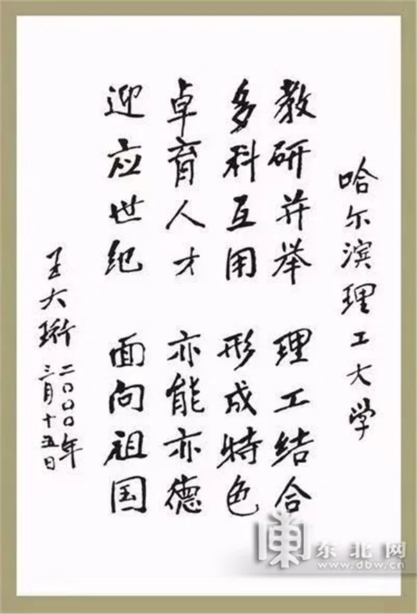2000年9月,85岁高龄的王大珩院士重返哈尔滨理工大学参加50周年校庆活动,为学校题写了“教研并举,理工结合;多科互用,形成特色;卓育人才,亦能亦德;迎应世纪,面向祖国。”这是他多年教育与科技实践形成的教育思想的结晶,也是新时期指导学校持续健康发展的办学思想。