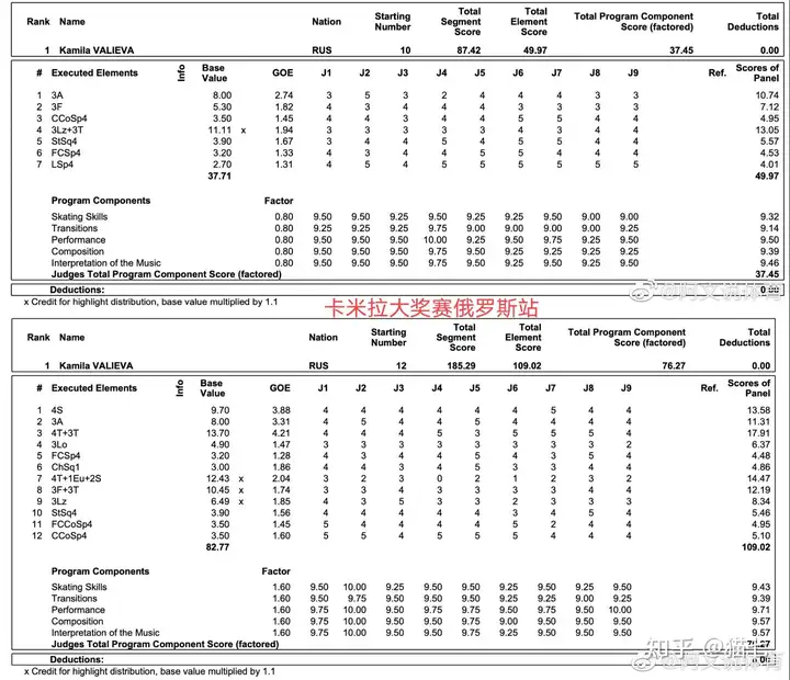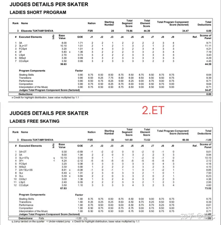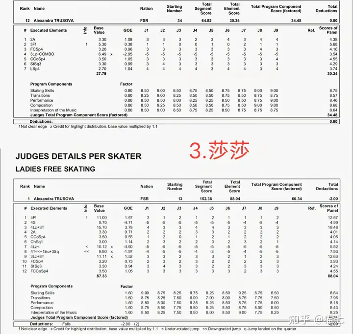只拿这次世锦赛来说,图一到三是2021世锦赛前三SP和FS的小分表,可以对比一下,虽然裁判戏挺多的,而且伤病也算比赛的一部分,但也能看出来水平的,尤其是莎莎自由滑五个四周,虽然吃了符号,但至少是站住了,陈虹伊应该是没有四周的,三周还存,这次构成是3lz 3t3t 3lo1eu2s3lz 3f2t 2a 2a,但两个3lz都做的不好还都是单跳,接3s变2s,3f双足,2a摔,而且滑行速度也不是很快很有力,看起来有气无力的