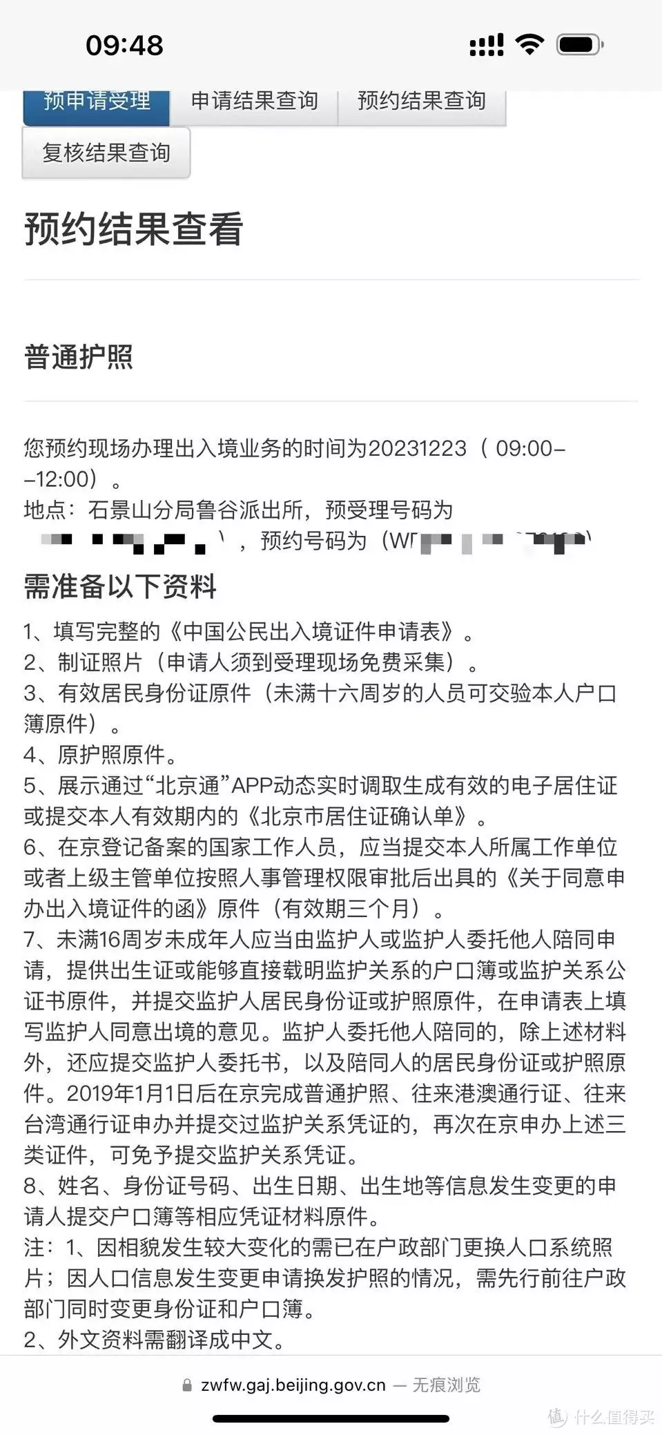 预约的流程讲完,接下来说办理流程:预约后会有个页面的,记得截图保存 。重要提示:基本上现在各个派出所出入境办理的都约满了,想要很快的办理,记得选择稍远的一点的出入境中心,比如,我去的石景山出入境大厅;