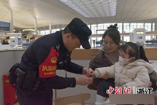 民警为乘车儿童佩戴防走失安全手环。杭州铁路公安处杭州西站派出所供图